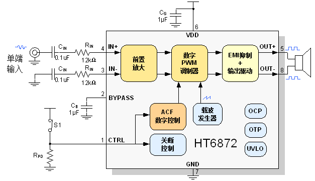 HT6872內部集成免濾波器數字調制技術(shù),能夠直接驅動(dòng)揚聲器,并最大程度減小脈沖輸出信號的失真和噪音。輸出無(wú)需濾波網(wǎng)絡(luò ),極少的外部元器件節省了系統空間和成本,是便攜式應用的理想選擇。
