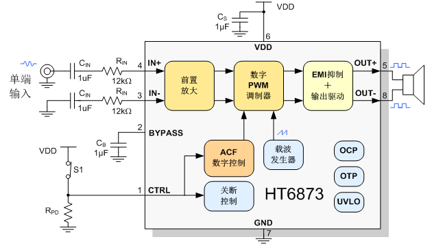 HT6873是一款高保真超低EMI的,具有防削頂失真功能的單聲道免濾波D類(lèi)音頻功率放大器。在5V電源,10% THD+N,4Ω負載條件下,輸出3.5W高功率,在各類(lèi)音頻終端應用中維持高效率并提供AB類(lèi)放大器高保真、低噪聲的性能。
