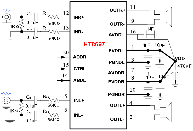 HT8697可實(shí)現AB類(lèi)和D類(lèi)的自由切換功能,在受到D類(lèi)功放EMI干擾困擾時(shí),可隨時(shí)切換至AB類(lèi)音頻功放模式。