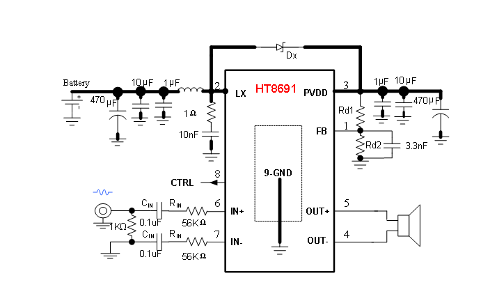 HT8691內部集成免濾波器數字調制技術(shù),能夠直接驅動(dòng)揚聲器,并最大程度減小脈沖輸出信號的失真和噪音。輸出無(wú)需濾波網(wǎng)絡(luò ),極少的外部元器件節省了系統空間和成本,是便攜式應用的理想選擇。
