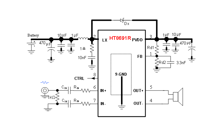 HT8691R內部集成免濾波器數字調制技術(shù),能夠直接驅動(dòng)揚聲器,并最大程度減小脈沖輸出信號的失真和噪音。輸出無(wú)需濾波網(wǎng)絡(luò ),極少的外部元器件節省了系統空間和成本,是便攜式應用的理想選擇。