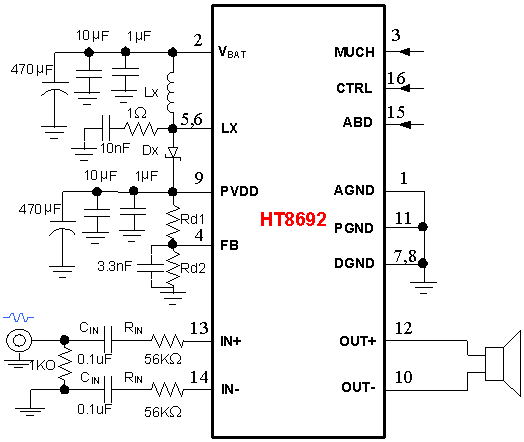 HT8692內部集成免濾波器數字調制技術(shù),能夠直接驅動(dòng)揚聲器,并最大程度減小脈沖輸出信號的失真和噪音。輸出無(wú)需濾波網(wǎng)絡(luò ),極少的外部元器件節省了系統空間和成本,是便攜式應用的理想選擇。