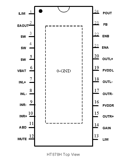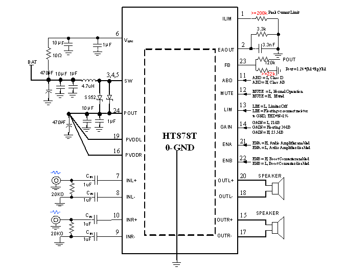 HT878T是一款內置自適應升壓的立體聲D類(lèi)音頻功率放大器,由鋰電池供電升壓至VPOUT=8.3V時(shí), THD+N=1%、1kHz信號條件下,能連續輸出2×6.8W功率(4Ω負載);另外,其還支持AB類(lèi)模式。