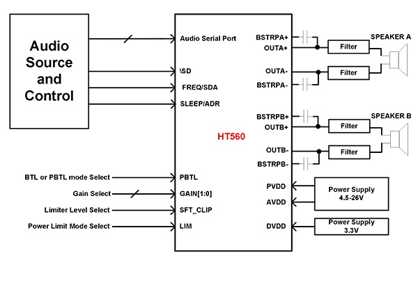 HT560是一款高效I2S輸入D類(lèi)立體聲音頻功率放大器。HT560可選硬件或者軟件I2C控制。在BTL模式,能夠提供2*30W/8Ω功率輸出;在PBTL模式,能夠提供75W/4Ω功率輸出。