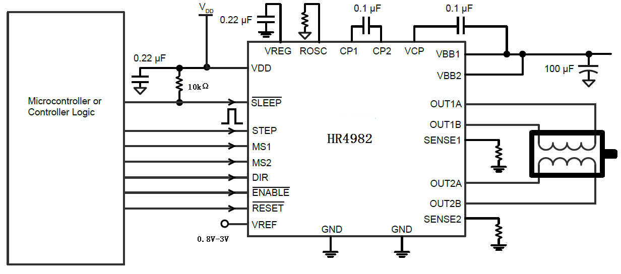 HR4982是一種便于使用的內部集成了譯碼器的微特步進(jìn)電機驅動(dòng)器。其設計為能使雙極步進(jìn)電機以全、1/8、1/16和1/128步進(jìn)模式工作。步進(jìn)模式由邏輯輸入MSx選擇。輸出驅動(dòng)能力達到35V和±2A。HR4982包含一個(gè)工作在慢衰或混合衰減模式的固定關(guān)閉時(shí)間的電流調節器。