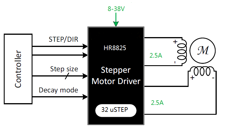 譯碼器是HR8825易于實(shí)施的關(guān)鍵。通過(guò)STEP簡(jiǎn)單的輸入一個(gè)脈沖就可以使電機完成一次步進(jìn),省去了相序表,高頻控制線(xiàn)及復雜的編程接口。這使其更適于在沒(méi)有復雜的微處理器或微處理器負擔過(guò)重的場(chǎng)合。